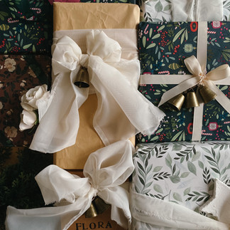 Gift wrapping is my favorite time to scrounge around the house for fabric scraps, foraged greens, thrifted bits and bobs, or even fresh fruit!